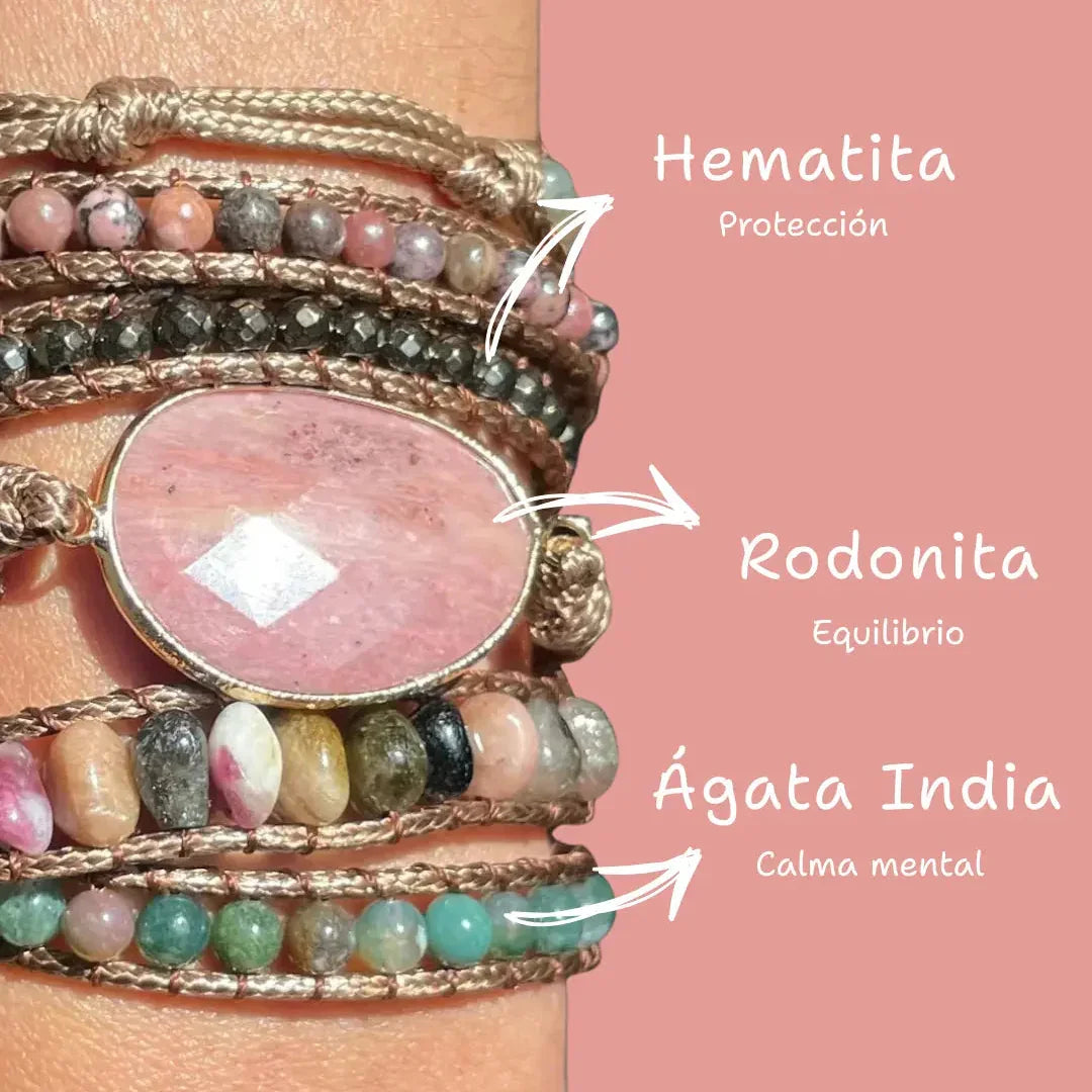 - Materiales: Rodonita natural, hematita pulida, ágata india auténtica